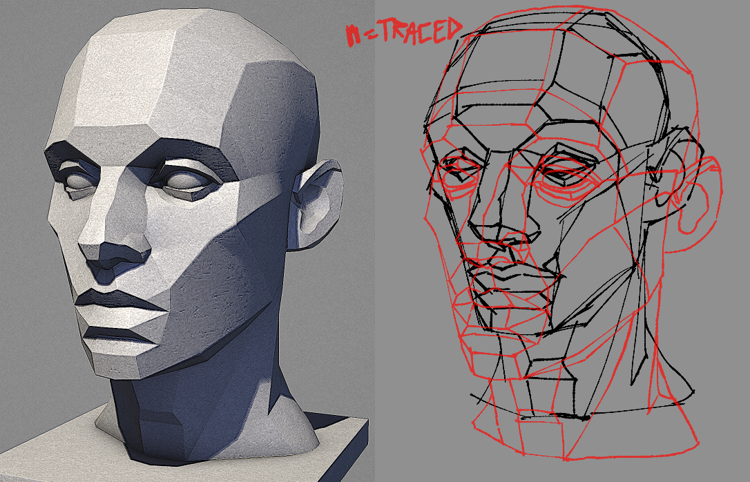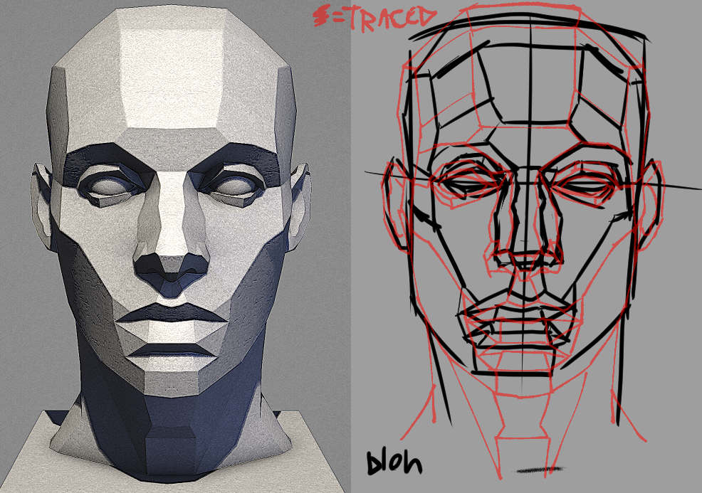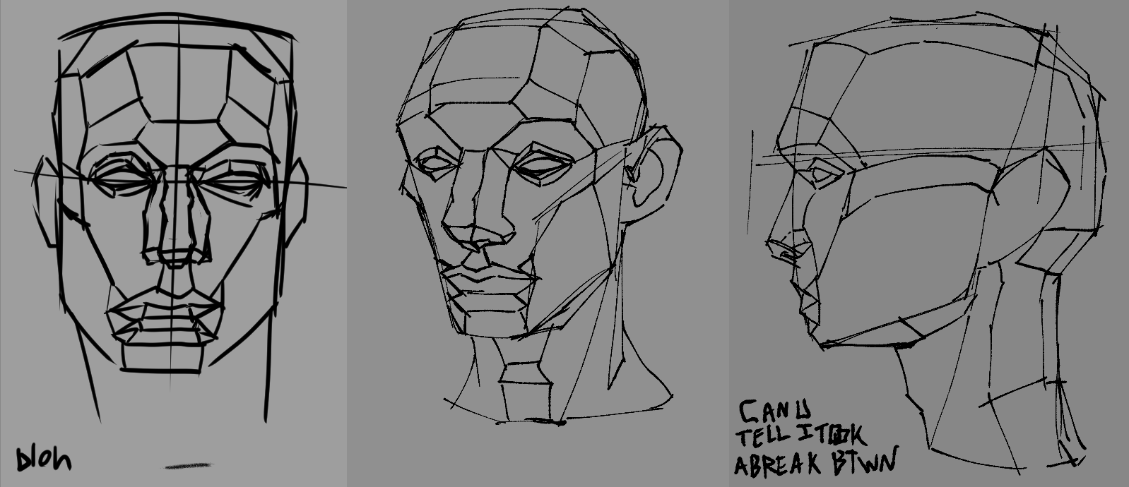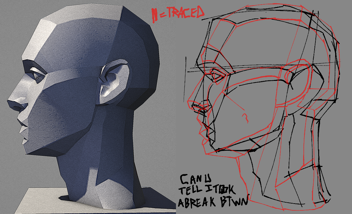 The next three images are drawing the Asaro head, i used this model for reference because I felt studying it was the best way for me to improve. I spent a whole day look at head drawing related videos and such and I obviously knew of different techniques but most go over the Loomis head and I don't find those particularly helpful. Not just cause it's beginner type stuff and I'm past that but also whenever they start talking about measurements and stuff I'm like huh? what? "drop the chin by 2/3rds" this means nothing to me. I might also look at Steve Huston and Reilly at some point see what fits best for me but just Asaro for now. Last image is the three studies I did but without the traced lines to make them easier to see.