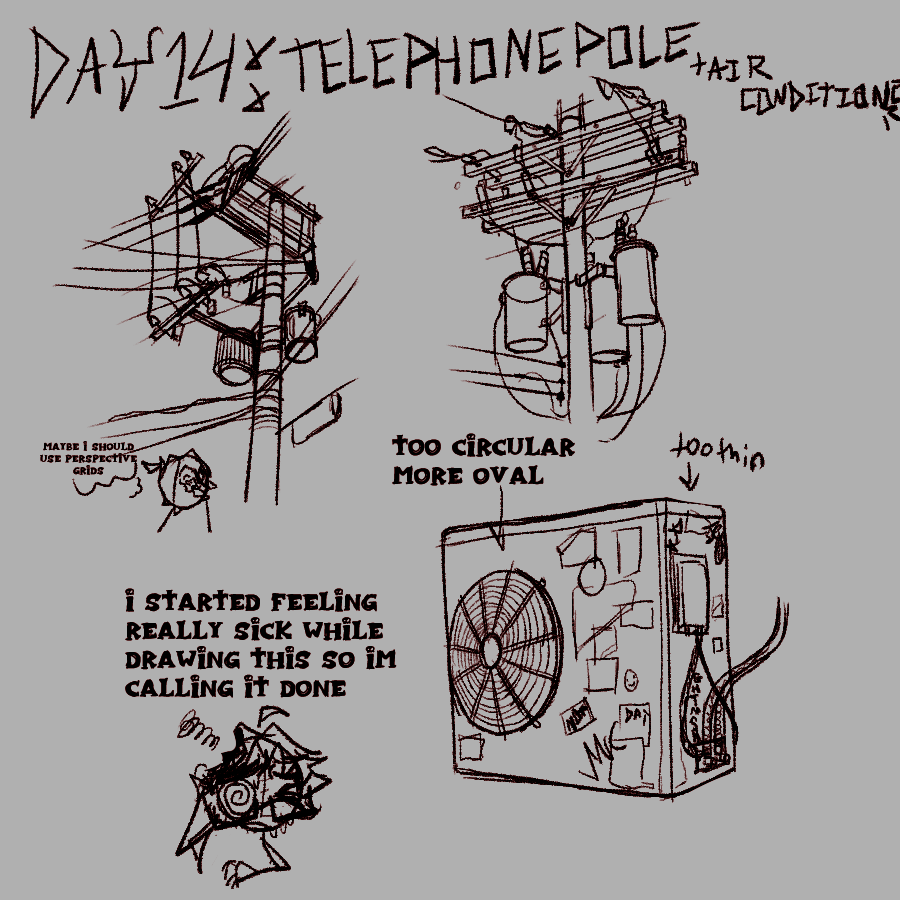 Day 14 is telephone poles, I love how they look and I definitely want to feature them some in my artwork but oh boy they are hard to draw haha, definitely gonna need to learn more and study them some. Also air conditioners because they're gonna feature in the environments I wanna draw too, I didn't really know where else to slot it though so I tacked it onto this day. Also as stated in the drawing I started to feel sick, actually while I was doing the second drawing (the top right) and took a break and then forced myself to finish. That's also why I delayed uploading this to my website I've not been feeling the greatest lately and I'm unsure as to why, my first guess is maybe I've made myself sick with stress and anxiety which I'm unsure how I would deal with that lol. I still wanna draw though so i'm hoping to get the next day done soon.