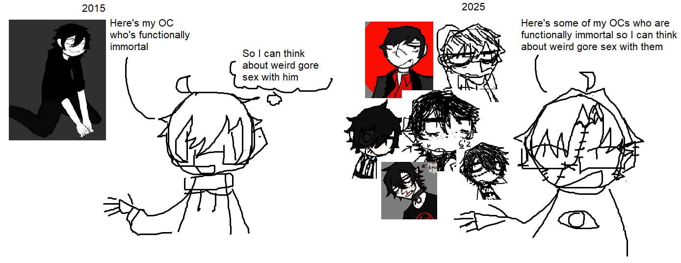 There's a couple of different reasons why I began to be more open about it; for starters it's related to what I've talked about before where I feel I had not been creating the art I really wanted to make and so I'm working on being able to create that art. And so I've become more self-indulgent and pornography and my kinks and fetishes go along with that indulgence. Even prior to 2025 there had always been "little hints" into the fact I was into this, characters portrayed as anxious; afraid, depressed; traumatized, victims in these fantasies, relationships of hate and fear, suggesting something horrible could happen. Hell the fact that my scrapped OC Male was immortal was so I could think about weird gore fetish stuff and have it be canon to his character. I've been into this since I was at least 15 and it was always present in my work, though never this openly before.